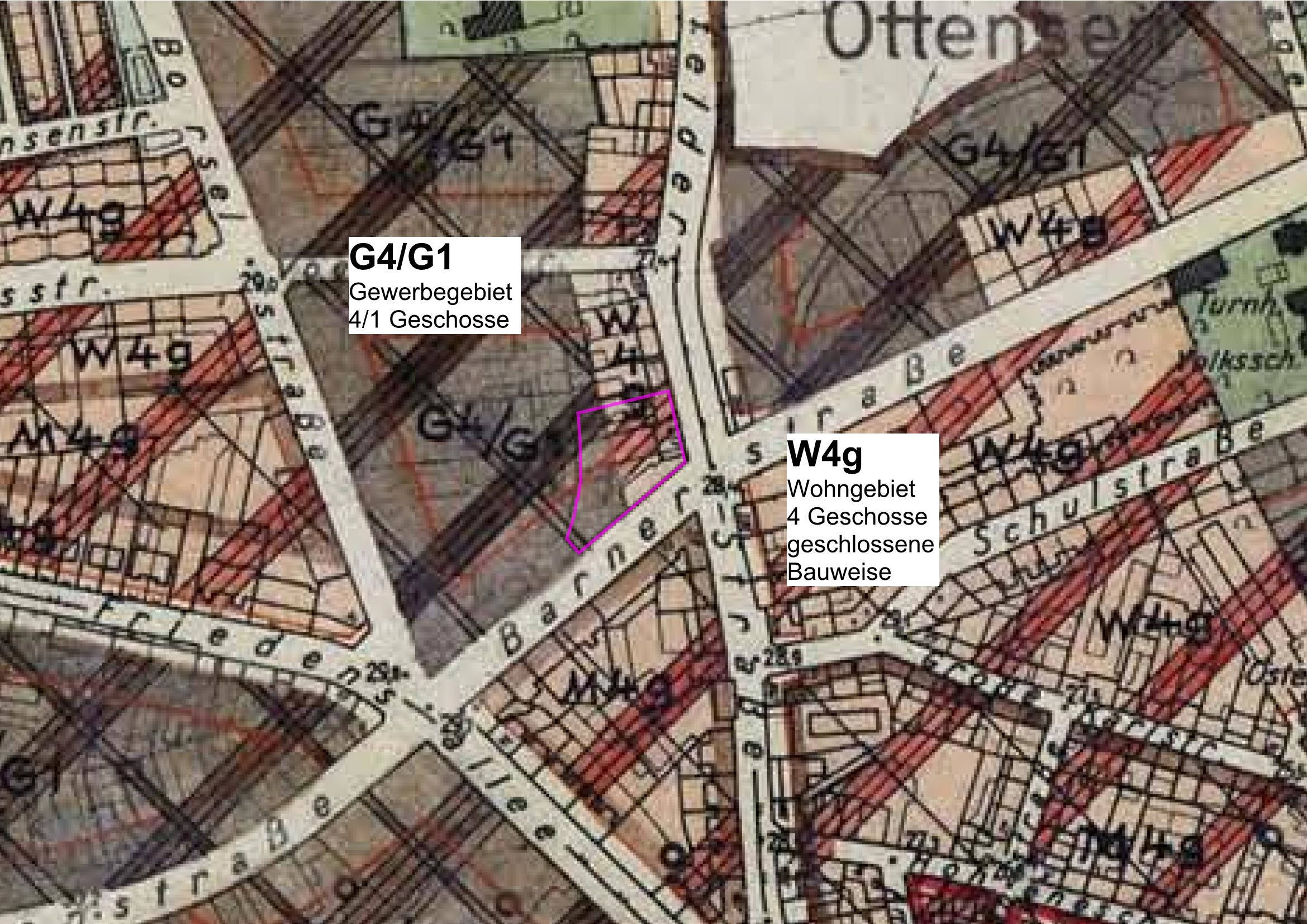 Auszug aus dem Baustufenplan Ottensen von 1938 / 1952. Die Stadt hat es versäumt in über 70 Jahren einen Bebauungsplan zu erstellen, bei dem eine Beteiligung der Öffentlichkeit nach § 3 BauGB vorgeschrieben wäre. |
