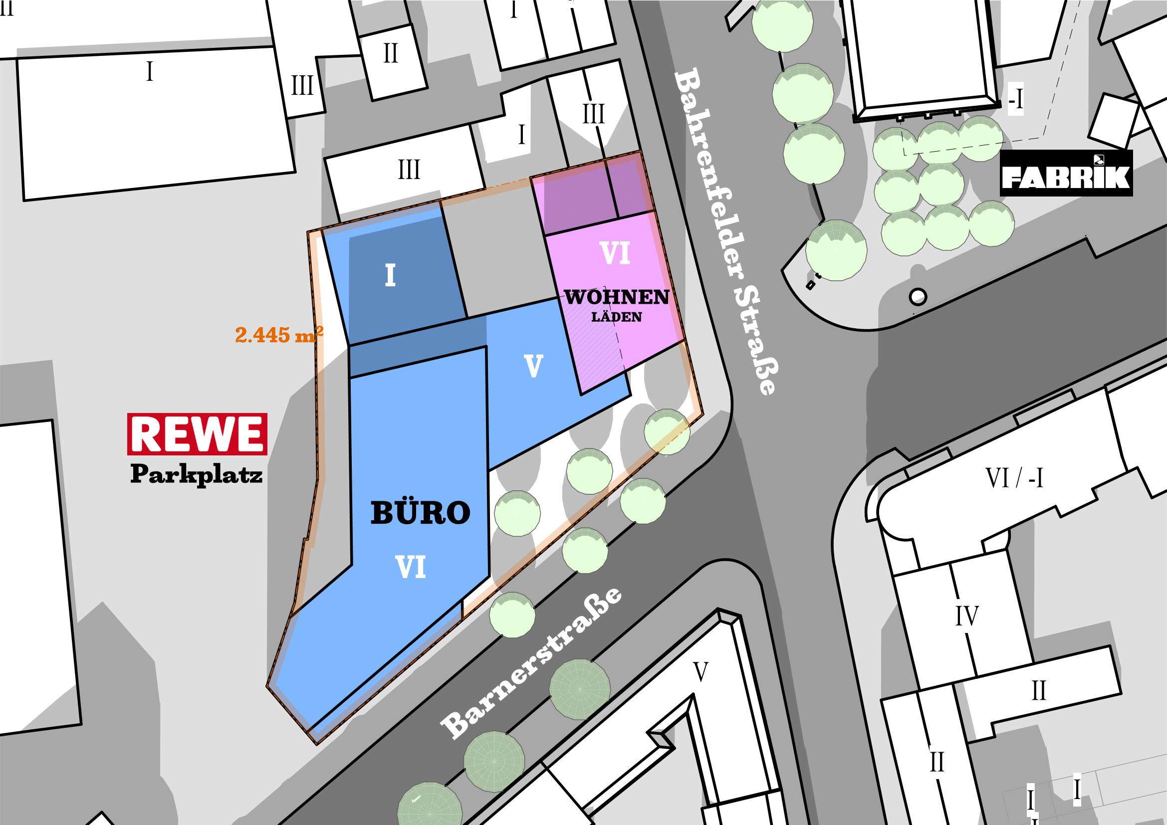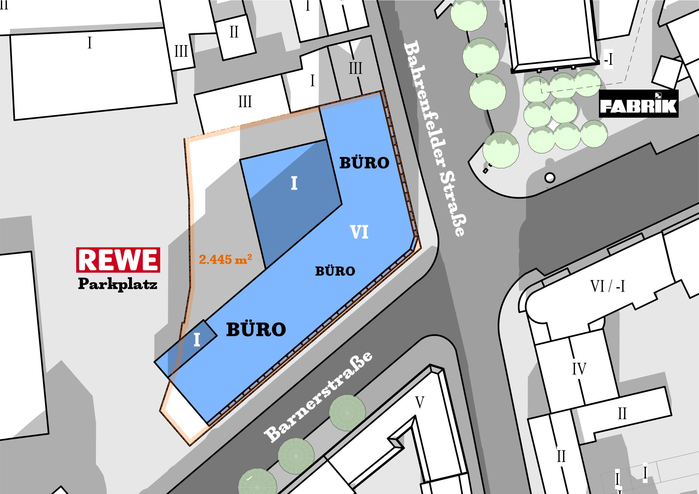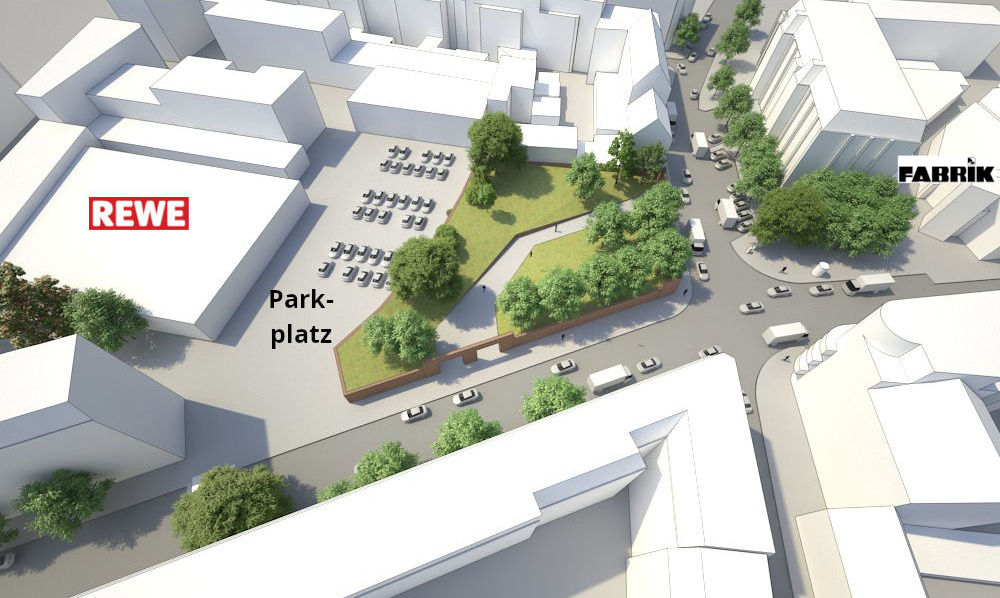 den dahinterliegenden REWE Parkplatz grenzte. REWE hatte Angst vor