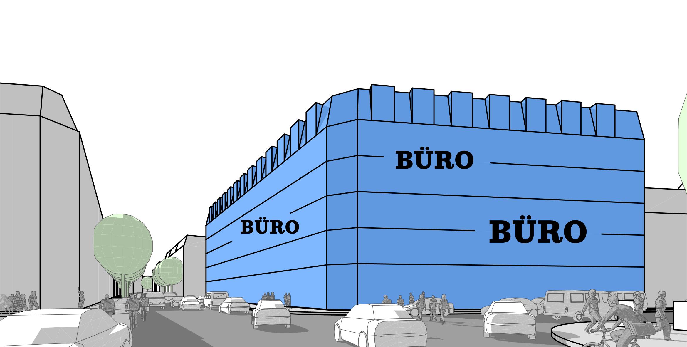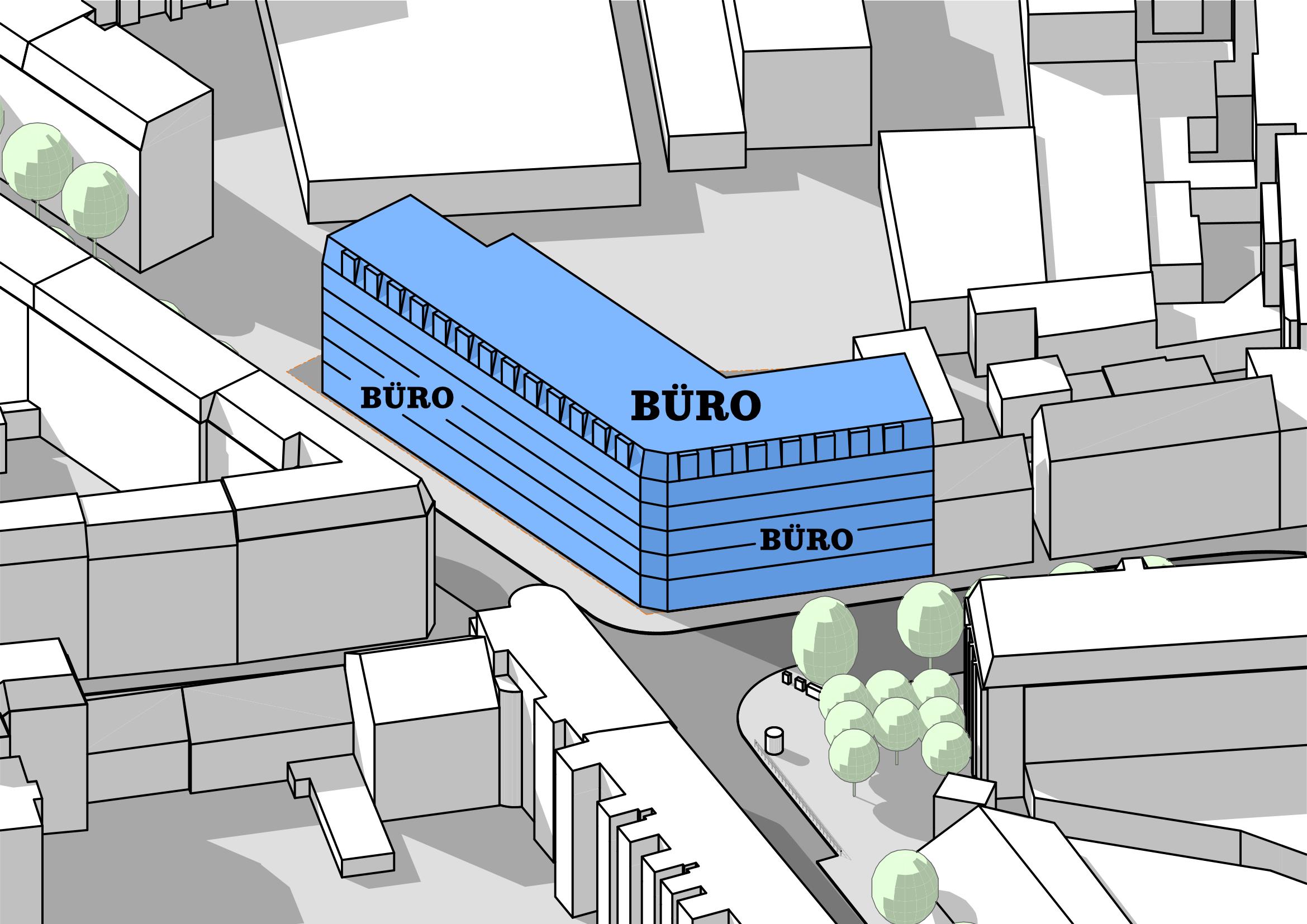 klagenden Anwohner und gab die notwendige nachbarliche Zustimmung nicht. Eine Neuplanung wurde notwendig. Das Resultat ist ein monofunktionaler, überdimensionierter Bürokomplex auf als Wohngebiet ausgewiesenen Fläche. Die politisch gewünschten Wohneinheiten werden dann in ca. 6 oder mehr Jahren an Präsident-Krahn-Straße entstehen, nachdem die Sparda Bank die Flächen frei gemacht haben wird. Der Deal Büroflächen jetzt - Wohnungen nach 2030 wurde unter Ausschluss der Öffentlichkeit von Investor, Bank und Stadt gemacht. Das Ergebnis ist sieht ungefähr so aus: |